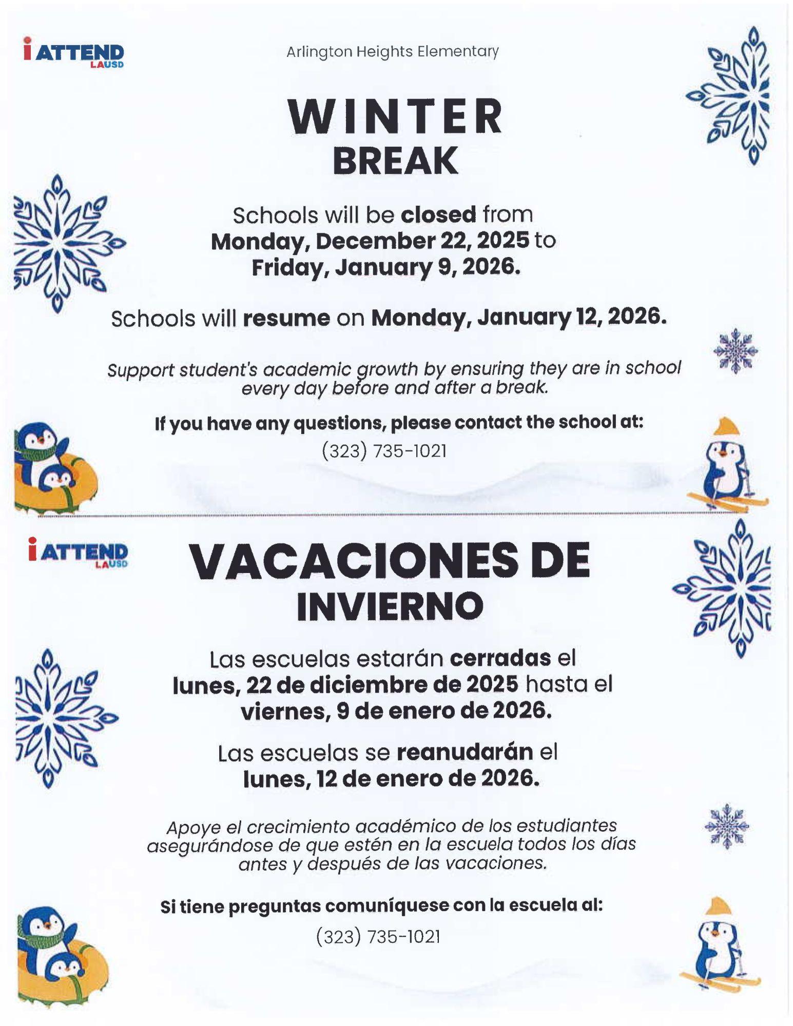 Winter Break (No School) / Vacaciones de invierno (No hay clases)